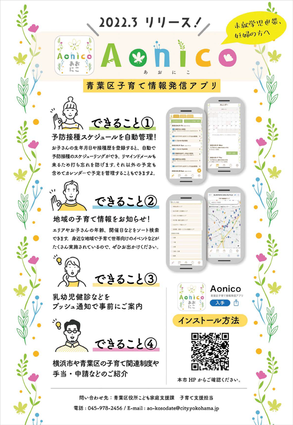 2022年3月22日にリリースされた青葉区の子育て情報アプリ「Aonico(あおにこ)」に、イベントの種類やエリア、子供の年齢、期間で地域の子育て情報を検索できる機能があります。