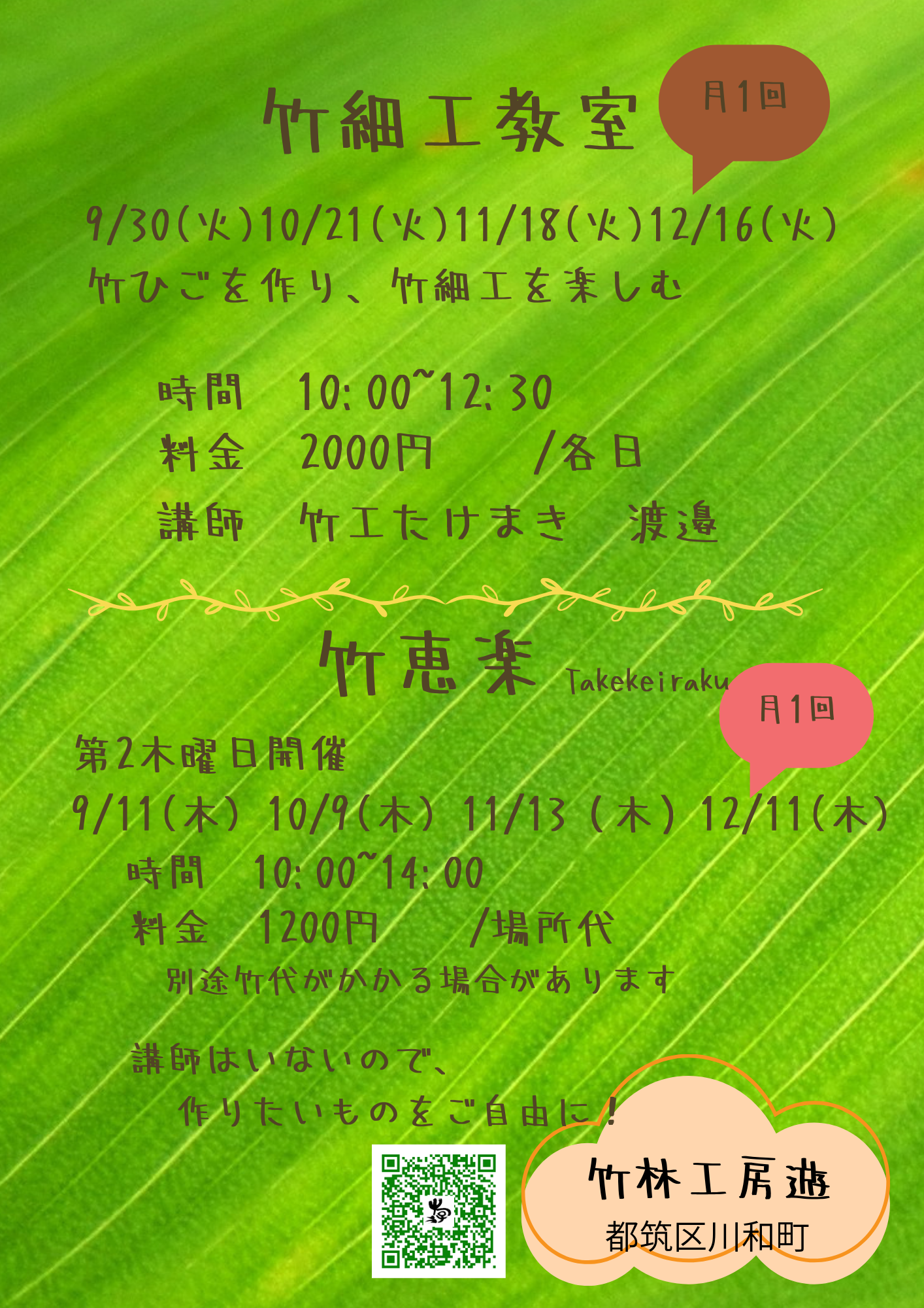参加費:回数券 12回10,000円 / 1回参加 1,200円(場所代)+実費(材料費)