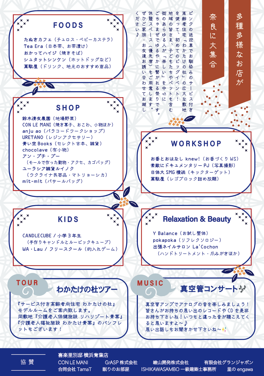 奈良のサービス付き高齢者住宅「わかたけの杜」の広大な敷地を使った初めての地域イベントです。当日は施設内のモデルルーム見学や、近隣の温浴施設の招待券の抽選会もあります。