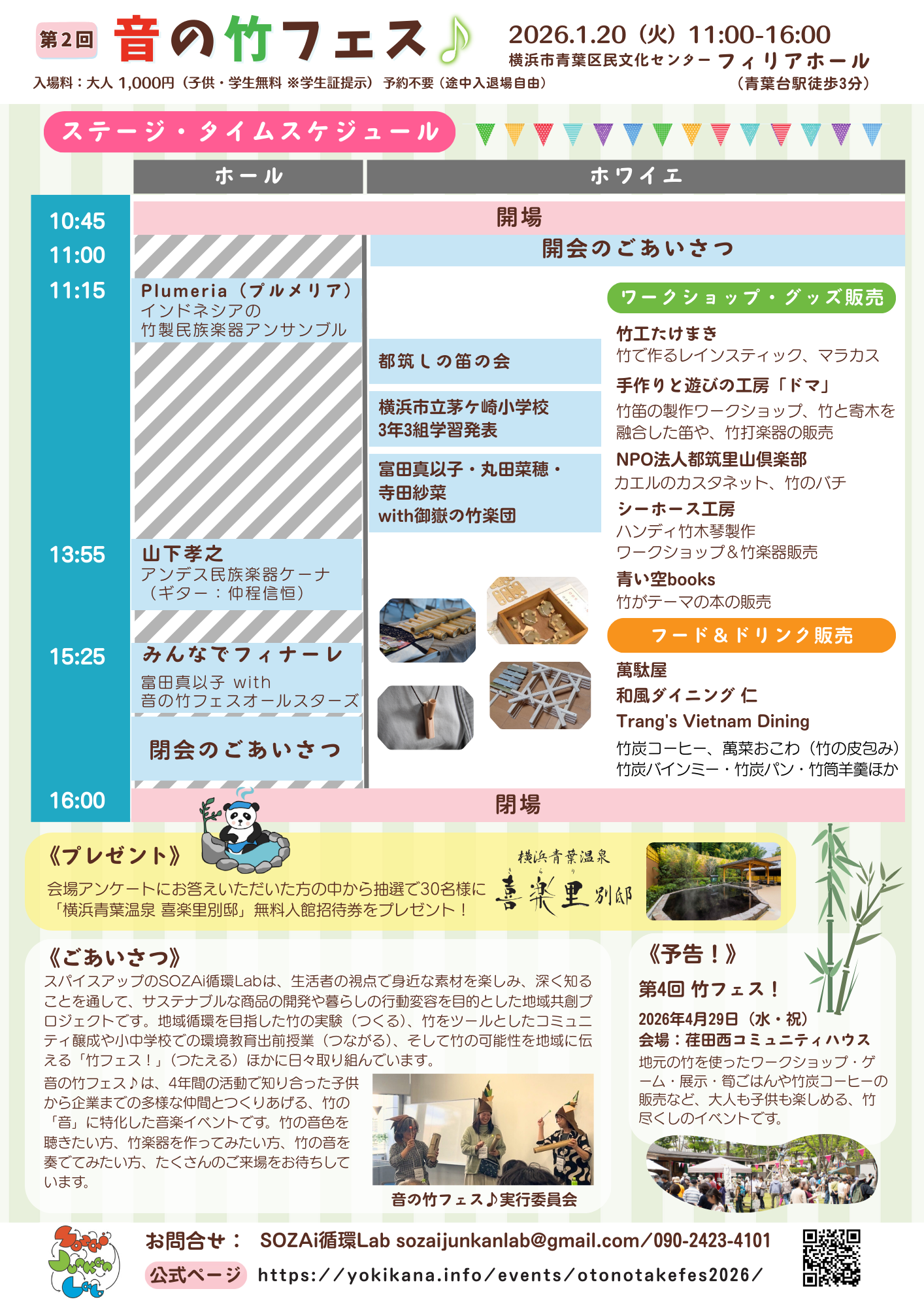 協賛: 横浜青葉温泉 喜楽里別邸・青葉台駅前郵便局・C2ラボ元石川・竹林工房 遊